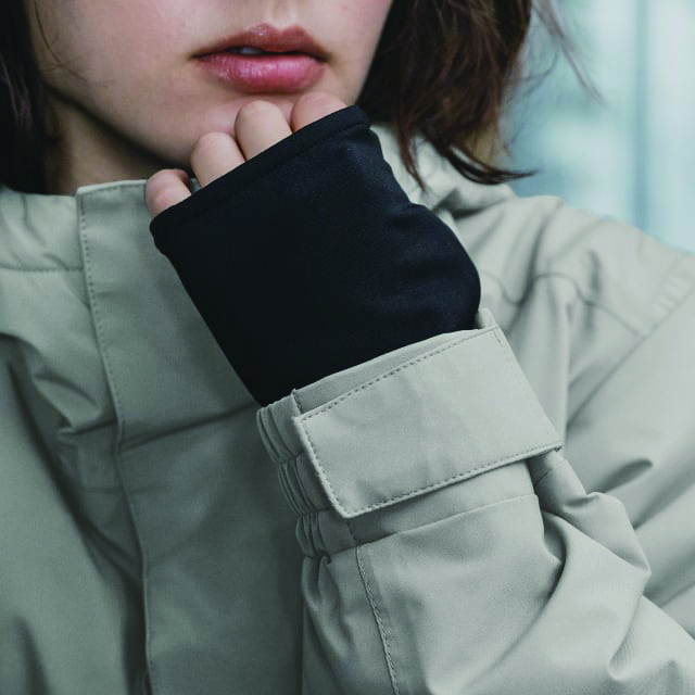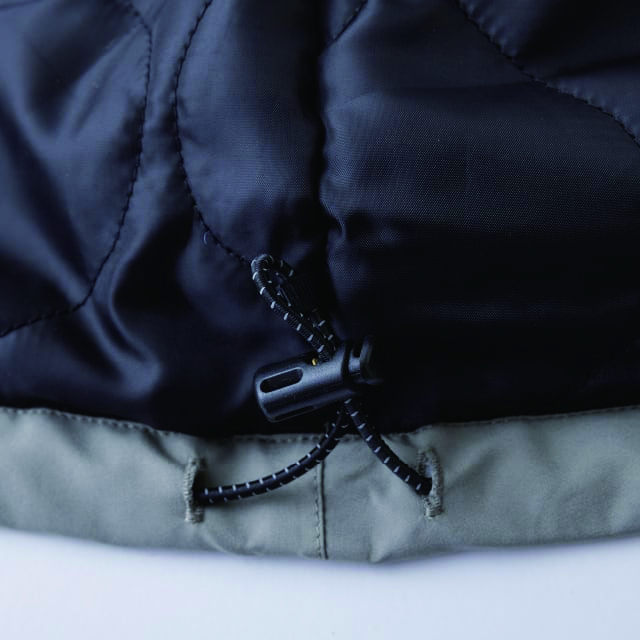 調整機能付きフィットフードとチンガード、さらに袖口のリストガードや裾ドローコードで冷たい風の侵入をしっかりブロックします。